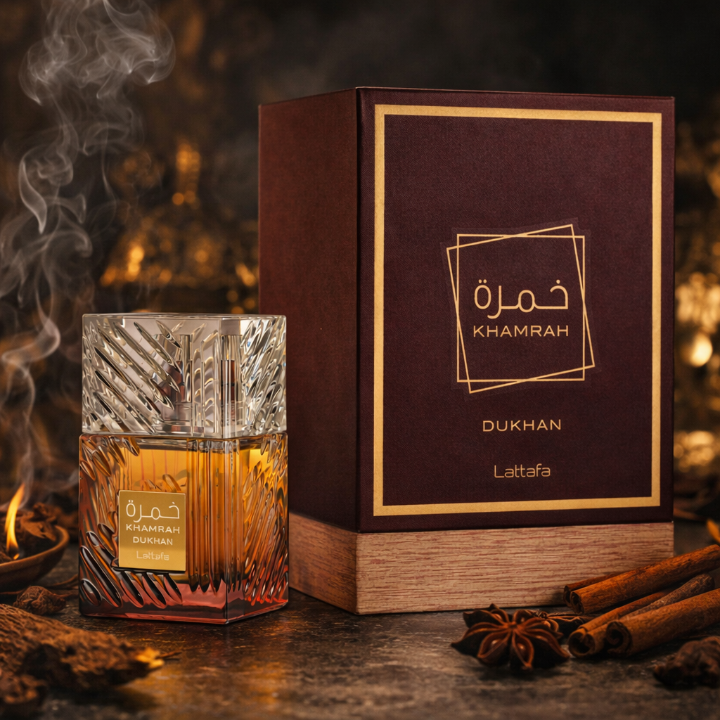 Khamrah Dukhan de Lattafa est une interprétation plus profonde, plus sombre et plus mystérieuse du mythique Khamrah.